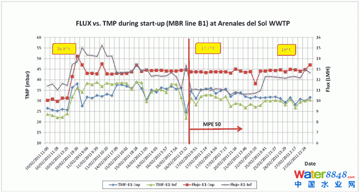 Figure 10: Flux versus TMP during startup (MBR line B1) at Arenales del Sol WWTP