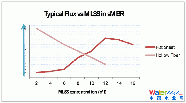 On-site biomass augmentation is thus unavoidable for any medium to large MBR plant, and the target MLSS concentration will depend on the membrane configuration: 5-8 g/l (or 10-12 g/l for short periods) for an HF configuration compared with 12 to 15 g/l for the FS. It follows that target biomass conditions are more rapidly attained for HF systems. Moreover, as often observed in MBR literature, FS membranes experience major fouling at lower MLSS from small pin-floc structures causing rapid pore blocking more rapidly. At higher MLSS levels and correspondingly larger flocs, the sludge-scouring air mixture provides greater higher shear and so an improved cleaning efficiency at higher MLSS concentrations (up to 18 g/l) than at lower.