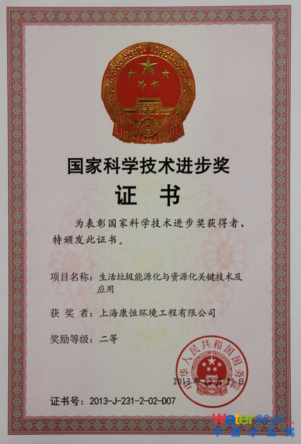 由上海康恒環(huán)境工程有限公司與同濟(jì)大學(xué)等高校共同開(kāi)發(fā)的科研課題“生活垃圾能源化與資源化關(guān)鍵技術(shù)及應(yīng)用”經(jīng)過(guò)專(zhuān)家審核,榮獲2013年度國(guó)家科學(xué)技術(shù)進(jìn)步獎(jiǎng)二等獎(jiǎng)。 |