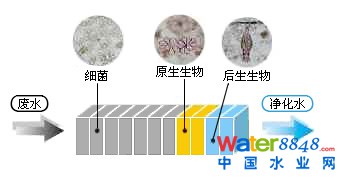 對(duì)曝氣槽實(shí)行多段化設(shè)計(jì),使之在槽內(nèi)形成自然的食物鏈,且在各槽內(nèi)充填可使好氣菌和厭氣菌共存的特殊載體,從而能夠?qū)崿F(xiàn)高處理能力,并減少污泥,可以說是具有劃時(shí)代意義的生物處理系統(tǒng)。