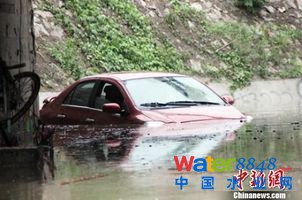 記者趕到積水較嚴(yán)重的韓莊街地道橋附近看到,橋下積水約80cm,一輛紅色轎車陷在水中,積水已到車窗位置,有市民拿來(lái)皮艇劃水嬉戲。據(jù)目擊市民介紹,16時(shí),該紅色轎車欲從橋下穿行,沖到橋下后被淹熄火,車內(nèi)一男子立刻打開(kāi)車窗爬了出來(lái),未造成人員傷亡。