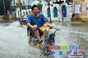 市民在韓莊街騎車通過(guò)積水路段。于俊亮攝
