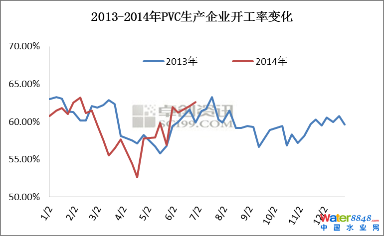 供大于求的現(xiàn)狀下,2014年我國PVC企業(yè)整體開工率依舊不高,1-6月份平均開工率不足60%,低于去年同期60.81%的水平。年初為迎接新的開始,我國PVC企業(yè)開工率不管是環(huán)比還是同比都維持慣性提升。然而,在國內經濟形勢疲軟、樓市不景氣的陰影下,2014年需求不及預期,PVC價格持續(xù)下跌,供應壓力日益凸顯,導致PVC裝置檢修期提前到來,開工負荷自3月份開始環(huán)比陸續(xù)回落。1-2月份PVC平均開工率為61.71%,而3-4月的平均開工率僅有56.9%。到5月中旬,隨檢修企業(yè)的陸續(xù)恢復及后續(xù)檢修企業(yè)的減少,整體開工陸續(xù)提升,到6月份PVC平均開工率提升至61.95%。