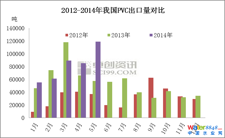 2014年在國內PVC市場競爭更加激烈的情況下,我國PVC供應商繼續(xù)積極擴大海外市場以緩解銷售壓力,同時希望取得更好的利潤收入,從而彌補國內價格低位運行帶來的長期虧損。2014年我國PVC出口依舊保持良好的增長態(tài)勢,1-5月累計出口量40.92萬噸,比去年同期增加11.32%。