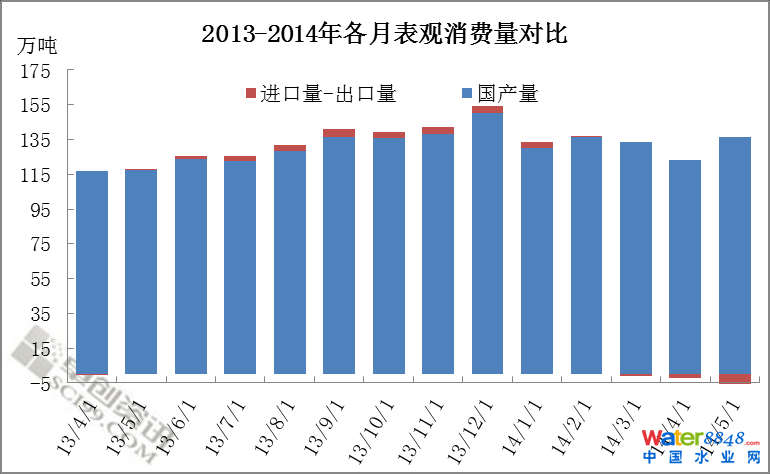 雖然樓市不景氣影響,上半年不管是型材還是管材行業(yè)開工率同比均出現(xiàn)下降。卓創(chuàng)統(tǒng)計數(shù)據(jù)顯示2014年上半年型材制品企業(yè)謹整體開工較去年同期低10%-20%;管材制品企業(yè)開工同比去年有10%左右的下降。但2014年制品產能基數(shù)較大,2014年1-5月份國內的塑料制品累計總產量在2763.2萬噸,較2013年同期增長7.5%。2014年1-5月我國PVC累計表觀消費量為654.37萬噸,累計同比增加10.3%。