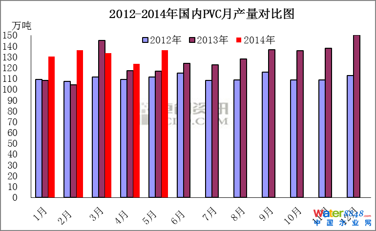 雖然2014年上半年我國PVC開工率低于去年同期,但供應壓力增加,2014年1-5月份累計產量675.62萬噸,同比增長14%。一方面是因為2013年第四季度集中投產的產量在2014年釋放;同時因2014年年初我國PVC價格跌跌不休,企業(yè)虧損情況惡化,西北企業(yè)為減少虧損,在保證產能不增的情況下,提升產量達到降低綜合生產成本的目的。