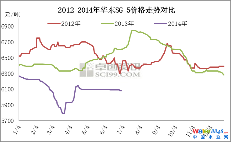 2014年上半年PVC市場表現(xiàn)異常低迷,一季度價格跌跌不休,二季度經過短暫反彈后長期僵持盤整,據(jù)卓創(chuàng)資訊統(tǒng)計數(shù)據(jù)顯示,上半年華東SG-5均價6092元/噸,同比去年6423元/噸的均價低331元/噸。具體行情表現(xiàn)為,經過春節(jié)假期的影響,一月份庫存壓力急劇增加,春節(jié)過后PVC市場呈現(xiàn)去庫存化的過程,由于去年新增產能較多,2014年產量大幅增加,所以一季度的去庫存化表現(xiàn)的尤為緩慢,巨大的供應壓力揮之不去,另外由于國內經濟下行壓力巨大, 房地產市場出現(xiàn)轉弱。在多重利空影響下PVC跌跌不休,截至3月下旬華東SG-5價格回落至5790元/噸,此價創(chuàng)下5年來最低位。隨著三月底市場庫存的逐步消化以及PVC企業(yè)集中檢修期提前,PVC市場供應壓力明顯減少,二季度初PVC市場開始觸底反彈,短短半個月的時間華東SG-5均價反彈至6150元/噸,較三月底低價漲360元/噸,4月下旬至6月底PVC市場處于弱勢平衡狀態(tài),市場貨源偏少,下游需求清淡,價格持續(xù)持穩(wěn)。