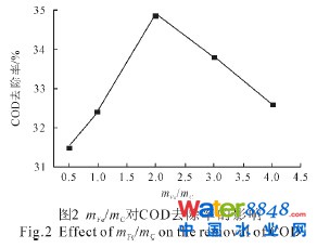 由圖2 確定mFe /mC=2:1 為最佳配比。此試驗(yàn)中廢水流經(jīng)鐵炭柱的過程可視為“動態(tài)的微電解”過程,鐵炭的比值直接影響到形成微型原電池的數(shù)目[2,4-5],當(dāng)通入廢水后,在反應(yīng)器內(nèi)會形成無數(shù)的電位差高達(dá)1.2 V 的“原電池”。“原電池”以廢水做電解質(zhì),通過放電形成電流和新生態(tài)的[OH]、[O]、[H]、Fe2+、Fe3+等物種對廢水進(jìn)行電解氧化還原、絮凝吸附、絡(luò)合和電沉積等作用[2,6]。[OH]有很強(qiáng)的還原電位(Eθ=2.80Vvs NHE),導(dǎo)致其可以在常溫常壓下幾乎無選擇性地與廢水中有機(jī)物發(fā)生反應(yīng),結(jié)果能破壞有色廢水中的有色物質(zhì)的發(fā)色基團(tuán)或助色基團(tuán),甚至斷鏈,達(dá)到降解、脫色的作用。由圖2 可知,當(dāng)鐵炭質(zhì)量比小于2.0 時(shí),隨著鐵屑量的增加,鐵屑與活性炭產(chǎn)生原電池的數(shù)目就相應(yīng)增加,處理效果相應(yīng)提高;在鐵炭質(zhì)量比等于2.0 時(shí)達(dá)到最大值;當(dāng)鐵炭質(zhì)量比大于2.0 時(shí),鐵屑過多會導(dǎo)致微電解不充分,使部分鐵屑難以和廢水充分接觸。Fe 量過高,F(xiàn)e2+生成過快,使溶液中積存大量的Fe2+,大部分Fe2+又可能與[OH]、[O]發(fā)生反應(yīng),導(dǎo)致COD去除率反而降低。