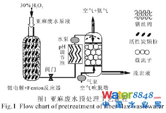 亞麻纖維制品在國際市場非常緊俏,是高檔的紡織制品。一方面,亞麻生產(chǎn)可以給人們帶來豐厚的經(jīng)濟(jì)收入,另一方面,由于該生產(chǎn)的廢水中含有高濃度、難降解有機(jī)污染物,如纖維素、半纖維素及其降解產(chǎn)物,木質(zhì)素及其降解產(chǎn)物,單寧、果膠、樹脂酸等,導(dǎo)致該廢水常呈棕黑色,有惡臭,化學(xué)耗氧量高且可生化性差,若將其直接排放會造成嚴(yán)重的環(huán)境污染。因而研究如何處理亞麻廢水以達(dá)回收再利用或達(dá)標(biāo)排放,實(shí)現(xiàn)綠色經(jīng)濟(jì)就顯得十分必要。目前對于亞麻廢水的處理,靠單一的方法很難達(dá)到預(yù)期目的,而傳統(tǒng)的處理工藝常采用幾種方法的有機(jī)組合[1],其中涉及生物處理的工藝要求被處理廢水可生化性要較好,廢水中有機(jī)物濃度不宜過高,但該工藝投資高且所耗時(shí)間比較長。