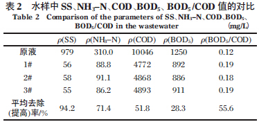 為了檢驗(yàn)優(yōu)化預(yù)處理工藝的穩(wěn)定性,取原廢液在優(yōu)化條件下做了3 次平行試驗(yàn),分析測定了原液、3 個(gè)處理液的SS、NH3-N、COD、BOD5、BOD5 /COD 值等指標(biāo),結(jié)果見表2。