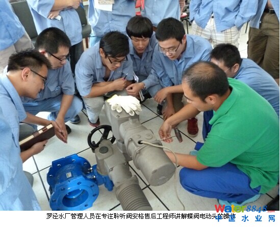 羅涇水廠(chǎng)管理人員在專(zhuān)注聆聽(tīng)閥安格售后工程師講解蝶閥電動(dòng)頭的操作