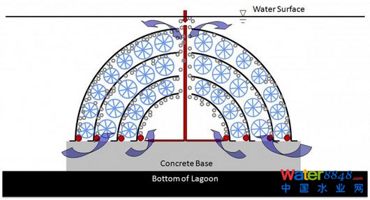 Poo-Gloo使用空氣、無(wú)光環(huán)境以及大表面積來(lái)培養(yǎng)細(xì)菌生物膜,這種生物膜就是用來(lái)“吃掉”廢水中的污染物質(zhì)的。24個(gè)或是更多的Poo-Gloo整齊地按列排在廢水塘的底部一起工作。每個(gè)Poo-Gloo由4個(gè)同中心嵌套的塑料圓頂構(gòu)成,這樣就為細(xì)菌的生長(zhǎng)提供了很大的表面積。在每個(gè)Poo-Gloo的底部都有環(huán)狀的氣泡釋放管道,空氣泡沿著每個(gè)塑料圓頂間的空洞上升穿過(guò),最終從Poo-Gloo的頂部離開(kāi)。在空氣流出的同時(shí),帶動(dòng)著水沿著同樣的路線流動(dòng),穿過(guò)細(xì)菌生物膜,達(dá)到污水處理的效果。