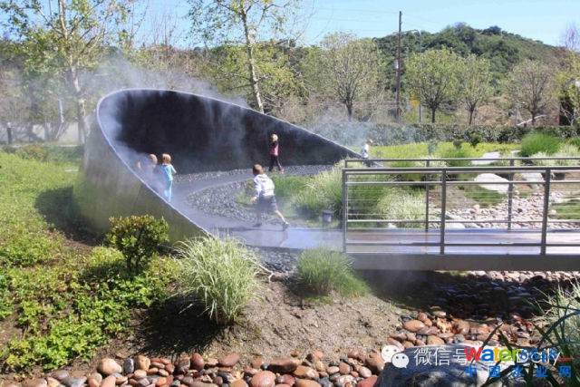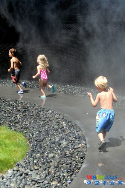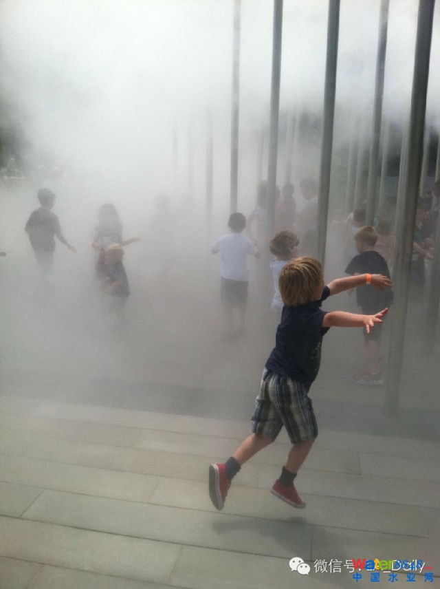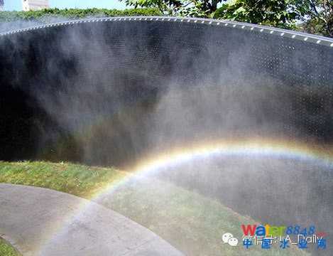 在酷熱的室外環(huán)境下,不只是天然植物能給人帶來清涼的感受,動(dòng)感景觀藝術(shù)家Ned Kahn通過他的創(chuàng)意水霧裝置有效降溫并增添更多的樂趣,可以讓孩子們即使三十多度的高溫下,也會(huì)在公園里東奔西跑,自由地鉆進(jìn)彩虹水霧,在清涼世界里享受人類設(shè)計(jì)和自然的奧妙。