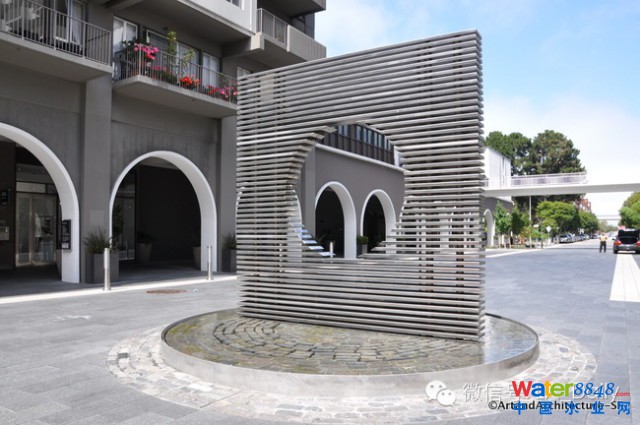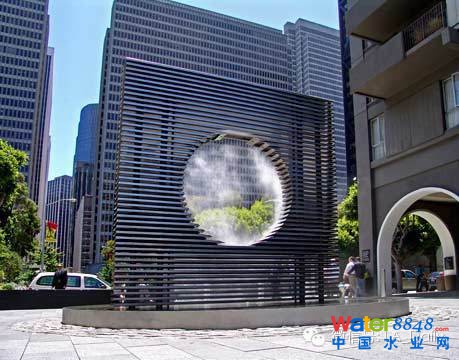 雕塑由多層水平的不銹鋼組成,霧從中央圓洞噴出。通過雕塑圓洞框景,透過層層薄霧,展現(xiàn)出城市新景觀。