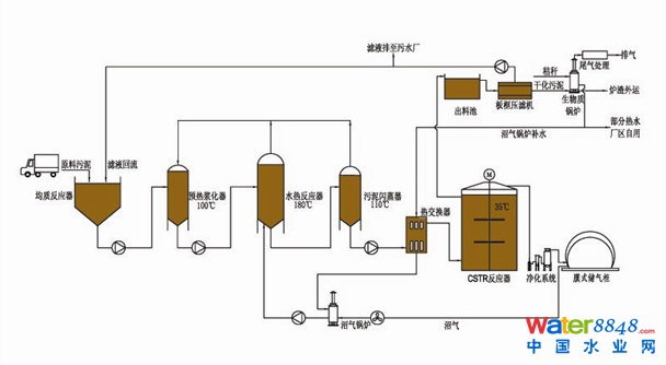 (2)污泥的資源化。通過(guò)水熱處理,污泥的固體有機(jī)物不斷溶解、液化,污泥中的VS有60%將轉(zhuǎn)化為沼氣,與傳統(tǒng)厭氧工藝相比,沼氣產(chǎn)量提高30~50%。