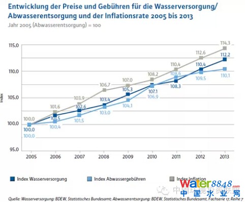(水供應(yīng)和廢水處理價(jià)格發(fā)展與通脹率比較:灰色為通脹率,深藍(lán)為供水,淺藍(lán)為廢水處理)