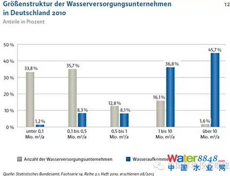 (2010年德國(guó)供水企業(yè)的規(guī)模結(jié)構(gòu)圖:灰色為企業(yè)數(shù)量比例,藍(lán)色為供水量比例)