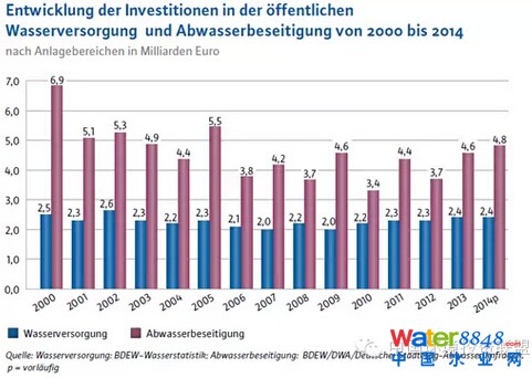 (在公共供水和廢水處理的投資發(fā)展:藍(lán)色為供水,紫色為廢水處理)