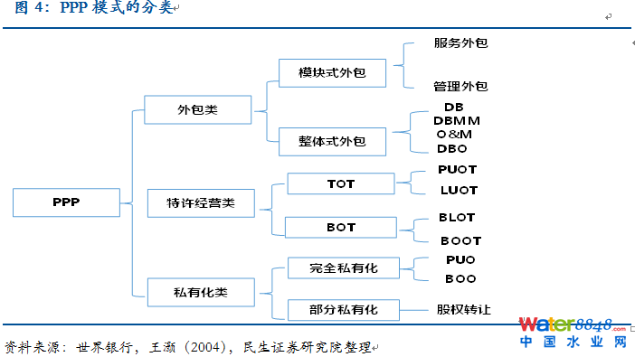 從廣義上來說,PPP指的是企業(yè)參與提供傳統(tǒng)上由政府獨自提供的公共產品或服務的模式。從世界銀行對PPP的分類來看,主要包括外包類、特許經營類和私有化類。因此,BOT本質上也可視為是PPP的一種。 資料圖