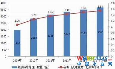 圖表1:2009-2014年城鎮(zhèn)污水處理市場容量增長情況(單位:座,億立方米/日)