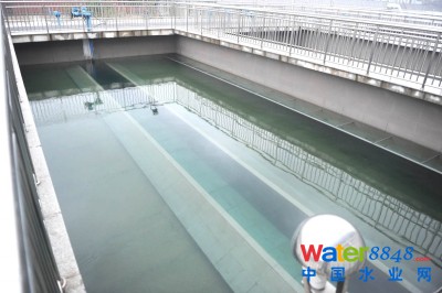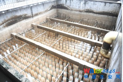 記者看到,在深8米的池中,一根根粘滿絨毛似的生物填料,豎立在池中,數(shù)量達(dá)到上百根。據(jù)介紹,整個生物接觸池分為兩組,一組分成四格,處理過后,進(jìn)入常規(guī)工藝的沉淀池。“水進(jìn)入沉淀池后,主要是讓水變清,濾去水中沉淀物,類似于過去在水中加礬的作用。”