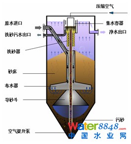 在空壓機(jī)的作用下,空氣提升泵將過(guò)濾器底層被污染的臟砂提升至過(guò)濾器頂部的洗砂器中,通過(guò)水流的紊流作用將砂表面的污染物分離出。清洗后的凈砂利用自重返回到砂床中,而清洗砂所產(chǎn)生的污水從過(guò)濾器的排污口排出。