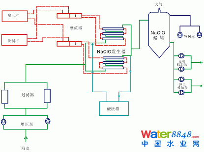 海水中含有大量的固體懸浮顆粒,會對次氯酸鈉發(fā)生器及其電解效率產(chǎn)生較大的影響。因此在海水被增壓泵抽入次氯酸鈉發(fā)生系統(tǒng)電解單元前,需經(jīng)過過濾器,將其中直徑大于0.5mm的顆粒除去。過濾后的海水通過電解單元,產(chǎn)生濃度為500~2000ppm的NaClO溶液,所產(chǎn)生的NaClO溶液隨即進入NaClO存儲箱。H2在存儲箱內(nèi)與NaClO溶液分離,通過鼓風機將H2稀釋到安全濃度下排入大氣。NaClO溶液通過連續(xù)投藥泵和沖擊投藥泵投加到需控制微生物的海水中。