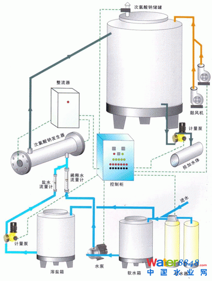 鹽水配水裝置:自來水進水經(jīng)軟水器軟化后,水中的鈣、鎂離子被去除,生成軟化水。一部分軟化水進入軟化水箱存貯,為次氯酸鈉發(fā)生器提供稀釋水;另一部分進入溶鹽箱溶解食鹽,成為飽和食鹽水。飽和食鹽水經(jīng)計量泵與稀釋水精確配水混合,進入次氯酸鈉發(fā)生器。
