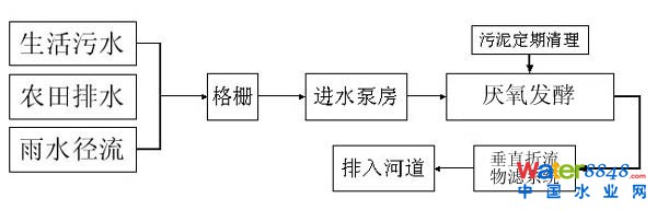 該工程為農(nóng)村生活污水處理工程,采用本公司垂直折流物濾系統(tǒng)集中處理,日處理量200噸/天,進水水質(zhì)劣Ⅴ類,出水達到一級A標準。