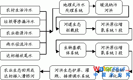 本工程總投資216萬元,本著高效、低耗、投資省、運行費用低、操作與運行管理便捷、充分利用當(dāng)?shù)刭Y源的原則。工程建成每天可處理污水量830m3 (其中含農(nóng)業(yè)面源排水、地下水滲漏及企業(yè)達(dá)標(biāo)排放尾水等),采用緩流納污河浜原位增氧-動態(tài)生態(tài)組合工藝處理農(nóng)村生活污水技術(shù)(ODBP)方案治理陳巷浜流域,系統(tǒng)治理后的水質(zhì)COD、總氮、總磷消減率達(dá)50%以上,污水經(jīng)處理后排入漕橋河。