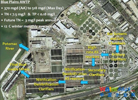 美國華盛頓Blue Plains污水處理廠由DC Water 負責管理,該廠處理規(guī)模為143萬噸/日,于1938年投入運行,當時還是一級處理。1959年升級到了二級處理,工藝是兩段法,第一段是去除BOD,然后沉淀分離,然后再進行硝化、反硝化。該廠目前還在雄心勃勃地升級發(fā)展,其中之一的計劃是希望能將厭氧氨氧化技術應用到主流工藝中,這將是對污水處理技術的重大創(chuàng)新和挑戰(zhàn)。