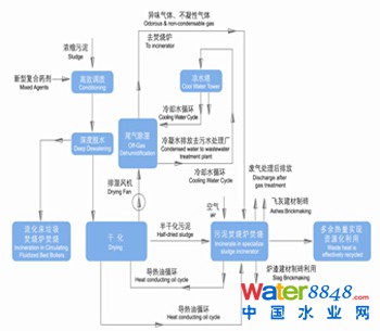 中產生的熱煙氣用于加熱導熱油,作為熱源用于將60%左右的污泥干化至小于40%,半干污泥又作為焚燒爐的燃料,使污泥焚燒處理的成本降到最低。污泥專用焚燒爐焚燒污泥時,污泥干化熱效率達85%以上,污泥焚燒效率達80%以上,爐膛床溫連續(xù)穩(wěn)定在850℃以上;煙氣在爐內停留時間5s以上,污泥干化過程中產生的異味氣體送至焚燒爐燃燒,煙氣通過煙氣凈化系統(tǒng)達標排放,不產生二次污染;焚燒爐焚燒過程中產生的多余熱煙氣以及烘干機產生的熱蒸汽用于電廠除鹽水加熱;噸污泥貢獻熱量為29.2kg標準煤;實現了市政污泥的無害化處置及資源化利用,整體工藝水平達到國內領先水平,該技術于2011年6月份通過省部級鑒定,鑒定為單項技術國內領先集成技術填補國內空白。本資源化焚燒系統(tǒng)更適合建在垃圾發(fā)電廠或熱電廠。