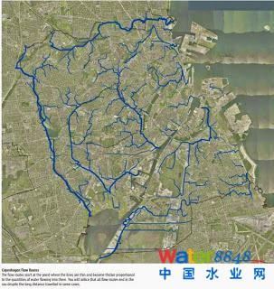 哥本哈根的水系圖,大部分水系最終都匯入港口或直接匯入大海。
