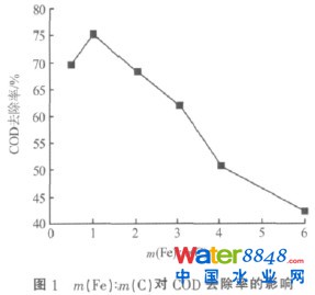 為了確定鐵炭微電解/H2O2反應(yīng)的最佳鐵炭比,根據(jù)初步試驗(yàn)結(jié)果,調(diào)節(jié)pH 至3、鐵粉投加量為30g/L、H2O2投加量為2.5 mL/L,反應(yīng)時(shí)間為120 min,改變石墨投加量,分析m(Fe)∶m(C)對COD 去除率的影響(鐵炭反應(yīng)水是經(jīng)混凝沉淀處理后的過濾出水),結(jié)果如圖1 所示。