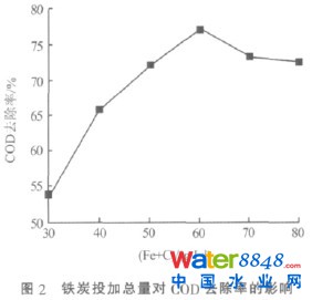 由圖2 可知,當(dāng)鐵炭投加總量為60 g/L 時(shí),COD去除率基本達(dá)到最大,繼續(xù)增加投加量COD 去除率反而下降。這是因?yàn)殡S著鐵炭投加總量的增加電解產(chǎn)生的Fe2+濃度升高,造成羥基自由基復(fù)合幾率增大,不能有效與有機(jī)物反應(yīng)〔5〕。綜合考慮COD 的去除和處理成本,鐵炭投加量以60 g/L 最適合。