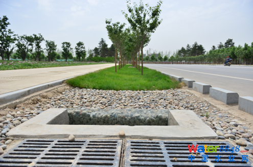 (道路兩旁的下沉式綠地隔離帶可以有效收集、滲透雨水。)