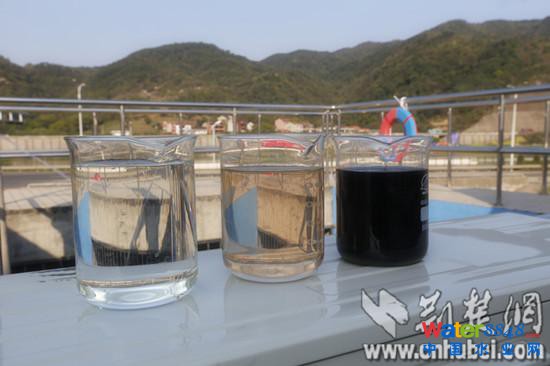 三種水質(zhì)依次為(從右到左)企業(yè)廢水、傳統(tǒng)污水處理廠處理后的水、活性炭技術(shù)處理后的水