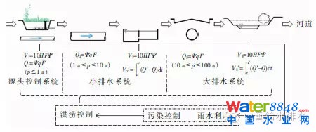 此外,還可從城市雨洪控制利用各子系統(tǒng)中的控制目標來分析調蓄系統(tǒng)的構成,即,由具有徑流總量和污染控制、雨水利用、排水防澇峰值控制等不同功能的各種調蓄設施所組成,也是源頭LID控制系統(tǒng)、小排水系統(tǒng)、大排水系統(tǒng)的重要組成部分。通過調蓄系統(tǒng)和管渠排放系統(tǒng)的有機組合,為構建城市良性水文循環(huán)和“海綿”城市發(fā)揮關鍵作用。