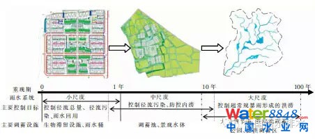 圖1 不同尺度雨水系統(tǒng)中調蓄設施構成的城市雨洪調蓄
