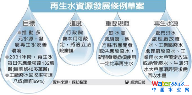 臺“行政院”本月可望敲定“再生水資源發(fā)展條例”草案,未來針對桃園、新竹、臺中、臺南與高雄等缺水高風(fēng)險(xiǎn)區(qū),將強(qiáng)制新投資案要使用一定比率再生水。
