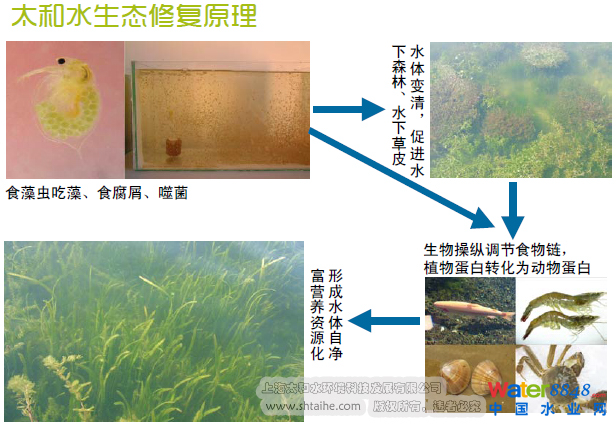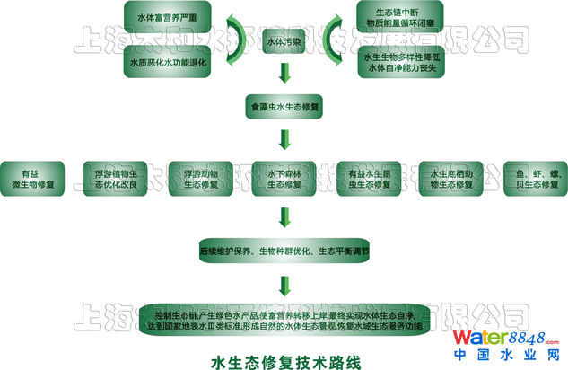 a.對其咸水種種群穩(wěn)定性淡水改良; b.對其消化吸收藍藻的腸道改良; c.對其攝食藍藻團塊口徑改良。 (2)水底植物培養(yǎng)和改良技術 構建耐寒型、耐污型、耐鹽型、耐溫型、四季常綠型沉水植物為主的水下森林,適用于各種水體和氣候。構建水下森林里的沉水植物種類,在光合作用下,能夠產生大量原生氧,可長久保持水體高溶解氧狀態(tài);促進氮的消化/反硝化作用及磷的沉降,抑制底泥再懸浮及氮磷營養(yǎng)鹽釋放,徹底改變富營養(yǎng)化水體氮、磷營養(yǎng)鹽循環(huán)模式,從而達到根除藍藻水華之目的。 (3)藍綠藻轉化成為水產品的生物鏈技術創(chuàng)新 食藻蟲是一種經長期改良馴化的可控制藻類污染的低等甲殼浮游動物。食藻蟲能夠大量攝食藍綠藻、腐屑、懸浮物與有害菌類,同時,其本身又是魚、蝦、蟹、貝等水生動物所喜愛的食物。這樣,藍綠藻轉化成為水產品的生物鏈有效地打通了,從而使水體的藻類污染得以根治。