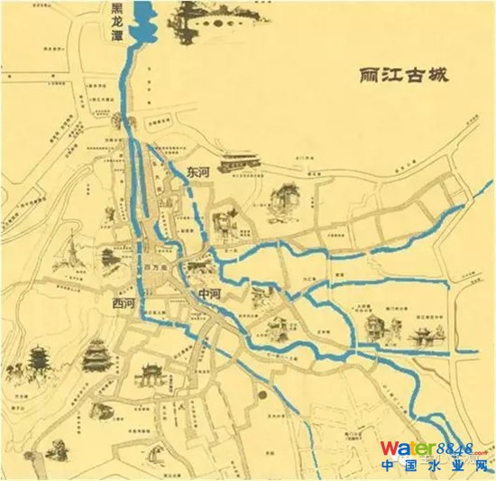 古城麗江對水體的保護和利用堪稱巧妙。麗江古城的水源來自于玉河水源頭——黑龍?zhí)叮惤藢⒂袼釉谟颀垬蛳乱环譃槿,形成東河、中河和西河三條水系。中河是古老的自然水系,自北而東南,穿過整個古城,把古城自然分為東、西兩城區(qū)。人工西河沿新華街入城,經四方街、光義街,在木府的東、南、西三面環(huán)流,尤如護城河一般,再一分為二出城。人工東河沿新義街入城,在小石橋處再一分為二出城。麗江人建城并沒有阻塞住潺潺不絕的高山泉水,自然河道與人工河道的巧妙結合使麗江主街傍河、小巷臨渠,顯得無比清凈而又充滿生機。麗江人還利用城內西河水的高低落差,按時提降閘門,使河水漫過街道清洗污垢,稱得上生態(tài)版“自動化環(huán)衛(wèi)系統(tǒng)”。