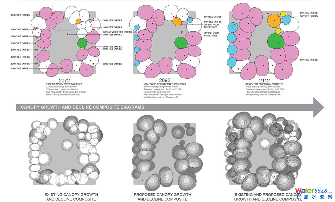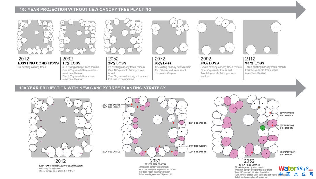 圖為100年內(nèi)樹木覆蓋的位置、大小和種類的預(yù)測。結(jié)果的重點(diǎn)在于改善空間、樹齡多樣性和增加樹木覆蓋面積。
