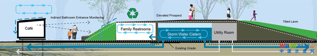 突起的地形起到地面公共設(shè)施核心的作用,可以把對根部系統(tǒng)的破壞降到最低,同時設(shè)有雨水蓄水池、盥洗室和雜