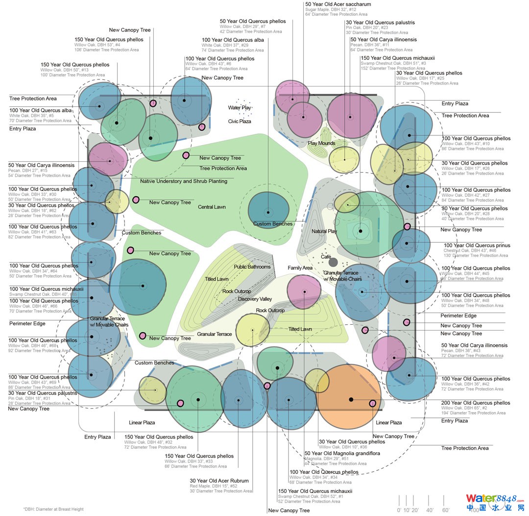設(shè)計的主要原則是可持續(xù)性原則,這包括一系列元素,比如長期的樹木管理、場地規(guī)劃和選材。對現(xiàn)有樹木的保護(hù)