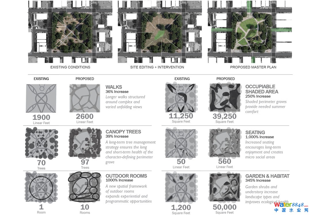 more paths, 250% more occupiable shaded areas, 39% more canopy trees, 1000% more formal seating