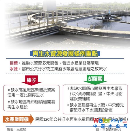 官員說(shuō),民國(guó)120年公共污水再生水開(kāi)發(fā)目標(biāo)量若要達(dá)77萬(wàn)噸,估約需再投資硬體500億元經(jīng)費(fèi),再加上污水下水道接管率及污水處理廠投資,至少引爆逾1,000億元水產(chǎn)業(yè)商機(jī)。