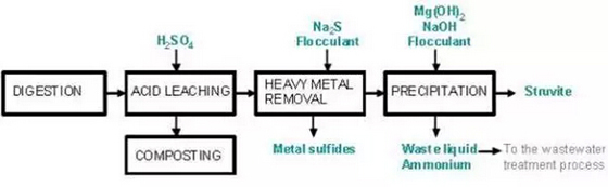 在酸浸泡階段,消化污泥與H2SO4相混合,用以降低pH。此時(shí),重金屬和磷酸鹽就會(huì)被溶解。在此過程中,可以加入氧化劑。兩小時(shí)以后,離心機(jī)就可以將非溶解態(tài)物質(zhì)分離出來。