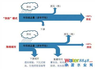 在國(guó)家住建部印發(fā)的《海綿城市建設(shè)技術(shù)指南——低影響開(kāi)發(fā)雨水系統(tǒng)構(gòu)建(試行)》中,就生動(dòng)地用圖例說(shuō)明了年徑流總量控制率概念,傳統(tǒng)的“快排”模式,降雨一部分蒸發(fā)(騰),一部分下滲,有超過(guò)80%被排放,而在海綿城市,除去蒸發(fā)(騰)環(huán)節(jié)通過(guò)透水鋪裝、下沉式綠地、生物滯留設(shè)施等下滲減排,采用蓄水池、雨水罐、濕塘、雨水濕地等積蓄利用,讓排放低于40%,降水通過(guò)有效的各種方式留存。并以這一指標(biāo)為標(biāo)準(zhǔn),結(jié)合各地區(qū)的具體情況,開(kāi)展海綿城市規(guī)劃與設(shè)計(jì)。