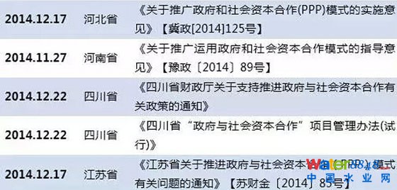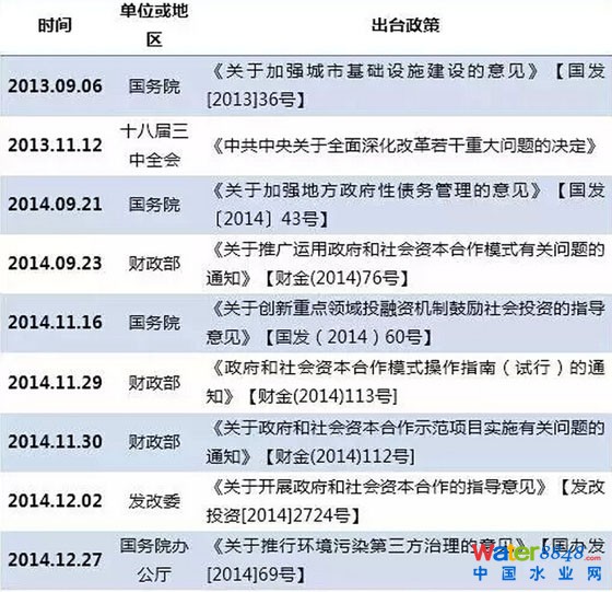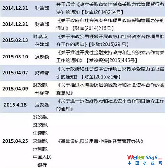 此外,值得一提的還有2014年12月27日國務(wù)院辦公廳推出的《關(guān)于推行環(huán)境污染第三方治理的意見》和2015年2與13日財政部聯(lián)合住建部發(fā)布的《關(guān)于市政公用領(lǐng)域開展政府和社會資本合作項(xiàng)目推介工作的通知》,兩個文件特別針對市政公用領(lǐng)域(含環(huán)保領(lǐng)域)PPP項(xiàng)目提出了具體的實(shí)質(zhì)性指導(dǎo)意見。